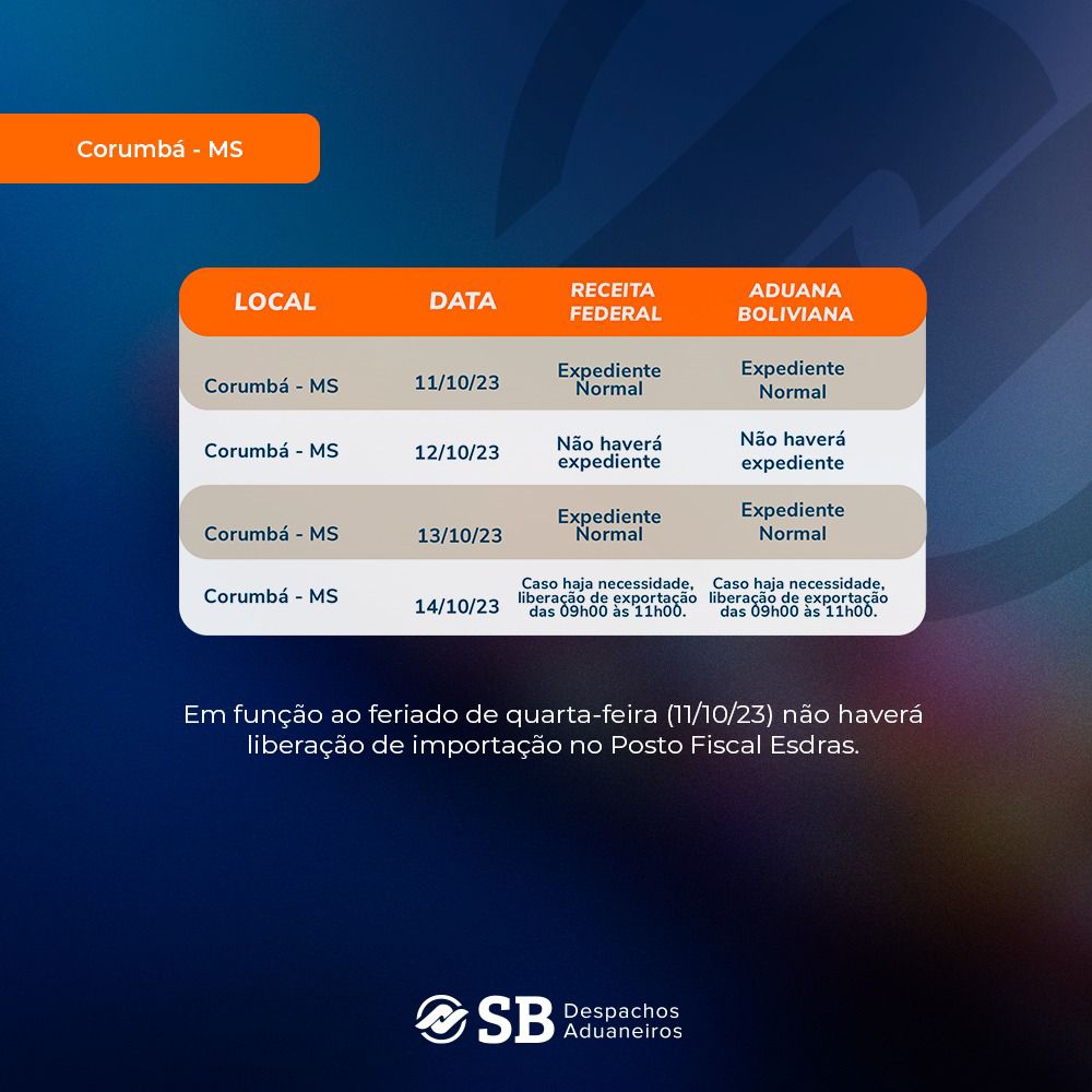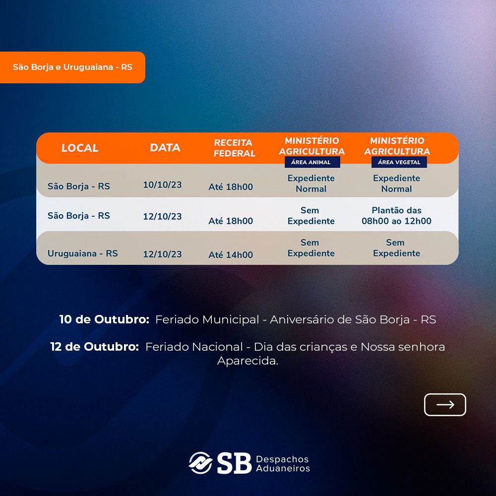 Confira os horários especiais das aduanas para no dia 10, feriado municipal de aniversário da nossa querida cidade, São Borja. E dia 12 (feriado nacional) aproveite ao máximo esses dias de celebração!